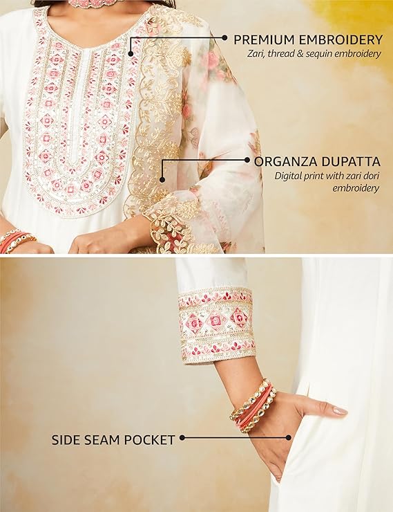 - PRODUCT DETAILS: 3-piece set featuring long length Anarkali kurta with embroidered yoke, 3/4th sleeves, and pocket, paired with straight-fit pyjama and printed organza dupatta finished with scallop edge zari Dori embroidery.